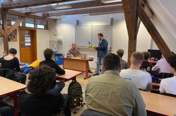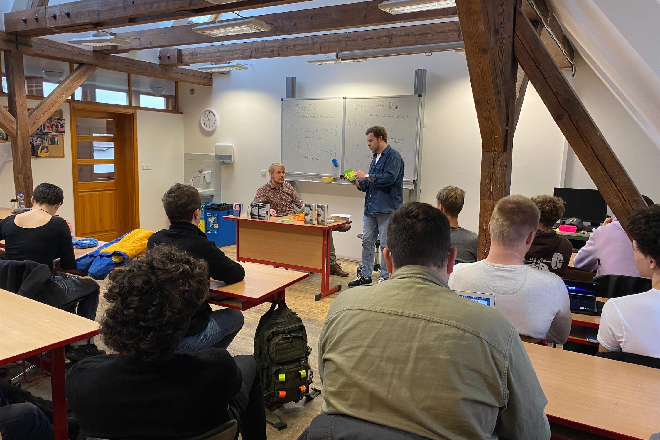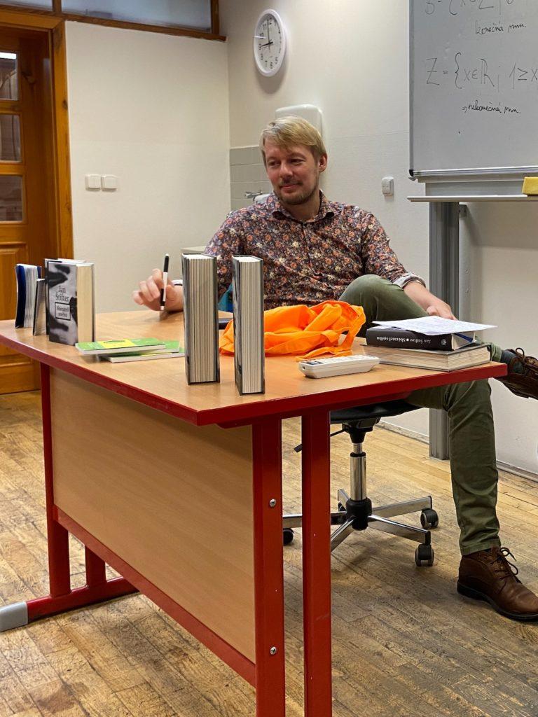 V pondělí 28. listopadu přijal pozvání Šimona Leitgeba a přišel našim studentům představit svou tvorbu. V hodinové besedě vyprávěl o lidech, které zasadil do svých příběhů. Jako kulturní historik se rád toulá po místech, která mají genius locí, neboť se tam prolínají osudy různých generací. Pro Jana Štiftera neexistují pevné hranice v prostoru a v čase, což je hra, na níž naši studenti nadšeně přistoupili. Nechali se provázet po Starém městě duchem chlapce Jozífka, anebo pronikli na zapřenou do Café Groll, jednoho z místních vykřičených domů z počátku 20. století. V závěru besedy zasedli s předky Jana Štiftera za stůl při Pavích hodech.