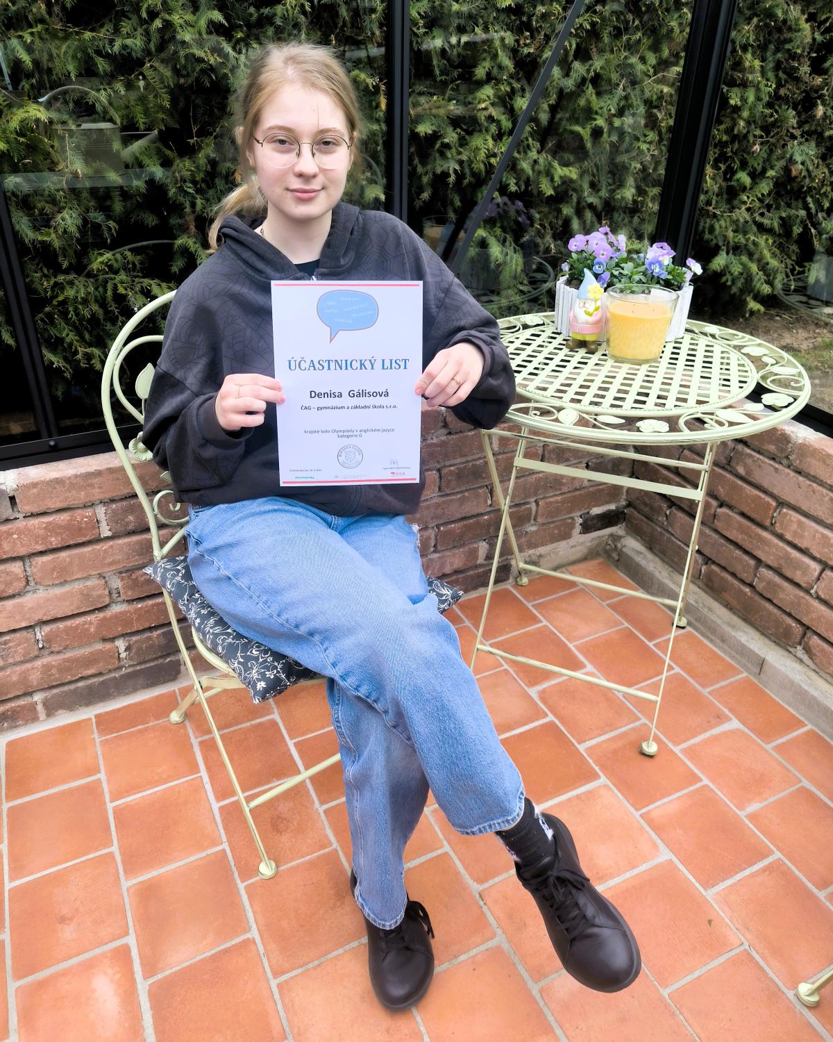 Studentka 1. ročníku Denisa Gálisová obsadila v Krajském kole olympiády v angličtině skvělé 4. místo s celkovým počtem 60 bodů.