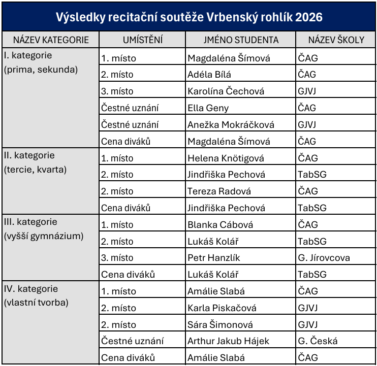 Letošní, již 26. ročník, Vrbenského rohlíku přinesl s sebou jisté územní rozšíření: z recitační soutěže českobudějovických gymnázií jsme se stali soutěží jihočeskou, neboť se vedle ČAG, Gymnázia Česká, Gymnázia Jírovcova a Gymnázia Jana Valeriána Jirsíka k nám nově připojilo i Táborské soukromé gymnázium. Doufáme, že toto jejich poprvé nebylo i naposled a že se zařadí mezi stálé účastníky akce.
